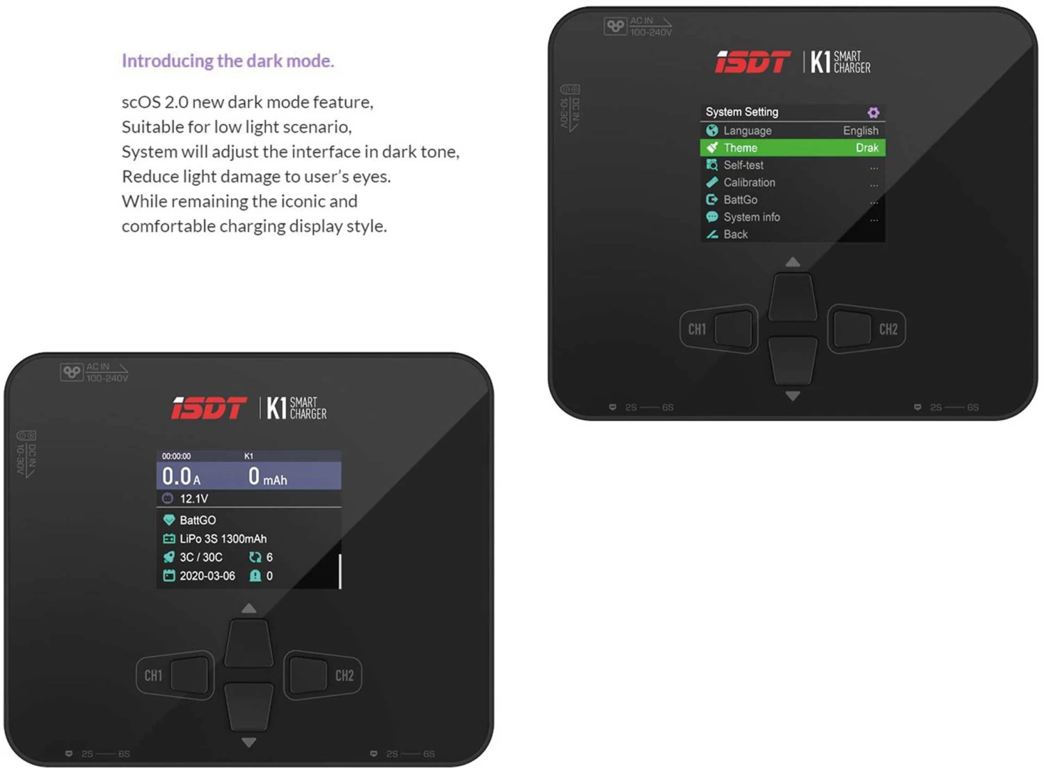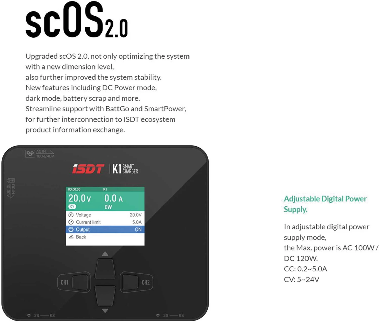 Das scOS 2.0 Update, optimiert nicht nur, sondern bringt die Software auf ein neues Level und verbessert auch die Systemstabilität. Neue Funktionen wie DC Power Mode, Dark Mode, Battery Scrap und mehr. Streamline unterstützt BattGo und SmartPower, um den Austausch von ProduktInformationen innerhalb der ISDT Systeme zu gewährleisten.