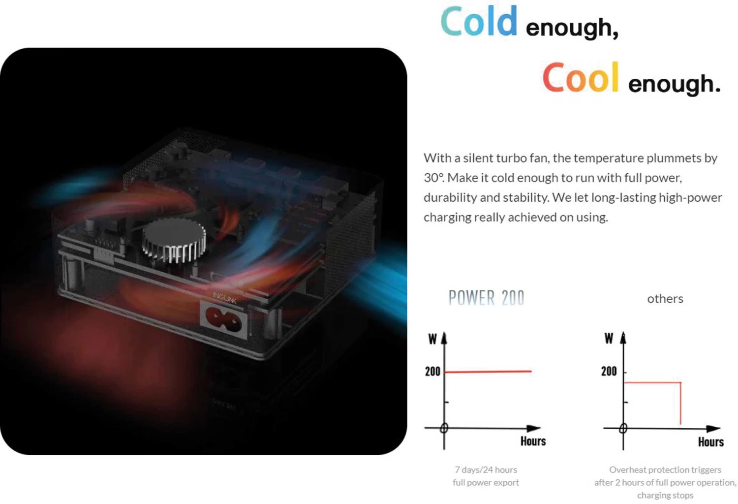 Dank des leisen Turbolüfters sinkt die Temperatur auf 30°C. Damit es kalt genug ist, um mit voller Leistung, Haltbarkeit und Stabilität zu laufen. Wir lassen lange Hochleistungsaufladungen wirklich stabil laufen.