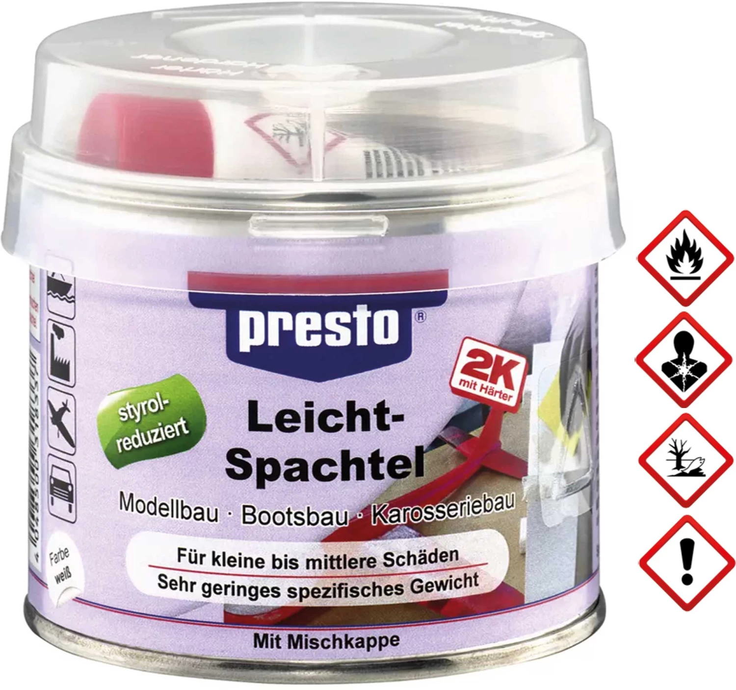 presto Leichtspachtel hat, durch den Einsatz neuartiger Füllstoffe, einen Dichtewert von unter 1 kg / dm³. Dies bedeutet, dass Leichtspachtel fast nur halb soviel wiegt wie konventionelle Spachtel, weshalb auch Objekte bearbeitet werden können, die nicht mit hohen Gewichten belastet werden können.