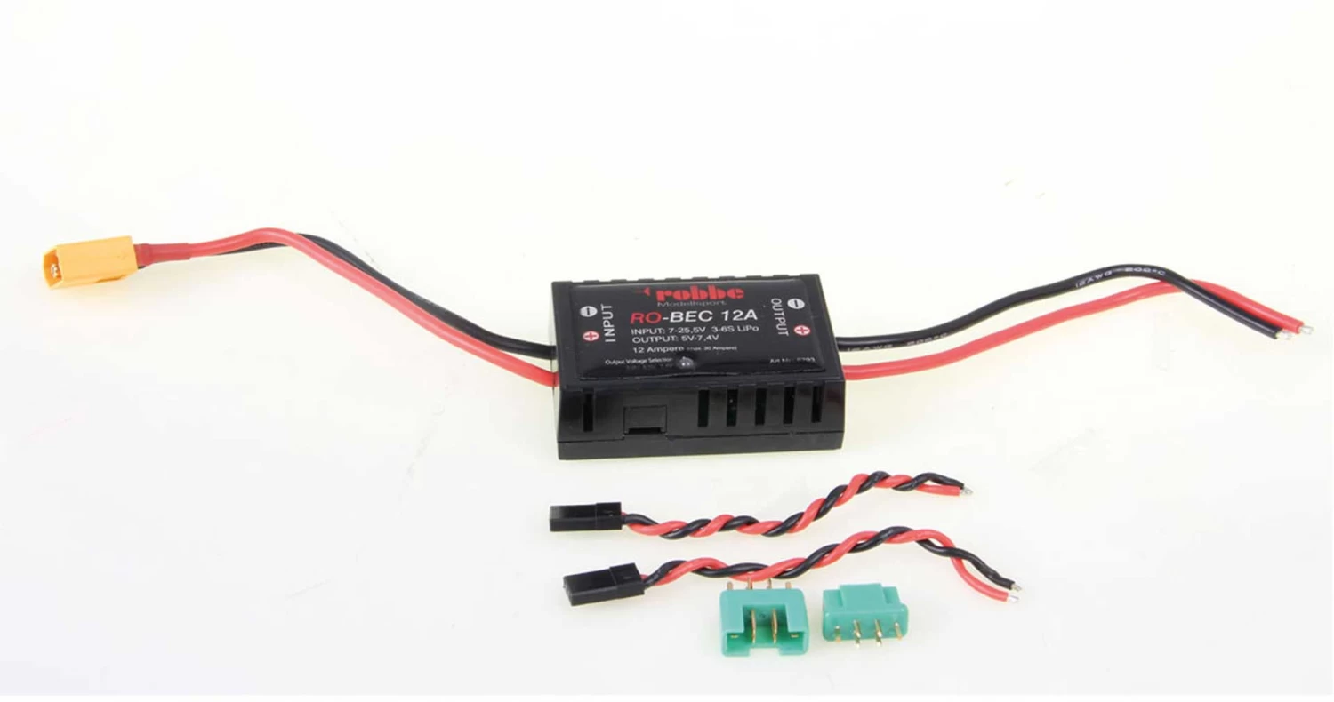 Um den heutigen Anforderungen gerecht zu werden verfügen die getakteten Schalt-BEC´s über eine wählbare Ausgangsspannung von 5, 6 oder 7,4V für den Betrieb mit HV Servos. Die RO-BEC´s haben einen breiten Eingangsspannungsbereich von 7-25,5 Volt (2-6S LiPo) und erreichen einen Wirkungsgrad von bis zu 93%. Ausgangsspannung 5,6 od. 7,4V. Die Abmessungen und Gewichte sind sehr geringgehalten, ohne dabei an Sicherheitsfunktionen, wie Überstrom oder -Temperatur zu verzichten. Es stehen vier verschiedene Größen in 4,6,8 oder 12A zur Verfügung. Wahl d. Ausgangssp.: Jumper.
